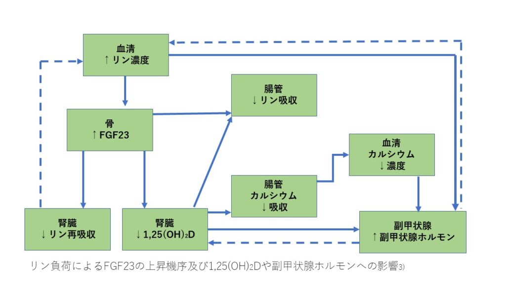 リンの摂取が促されると、それを排泄しようとFGF23:Fiblobrast Grows facter 23 線維芽細胞増殖因子の分泌が増大します。FGF23の増加は、それ単独でビタミンDの活性化を阻害します。