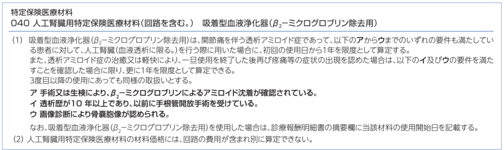なので、適応は「吸着型血液浄化器(β2-ミクログロブリン除去)」となっています。