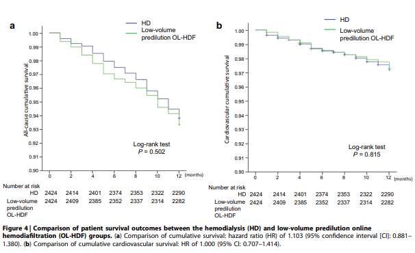 傾向スコアマッチングによって得られた 2,424 組の患者を使用して、HD群と低容量前希釈OL-HDF 群 (セッションあたりの平均置換容量25.1±9.4L) の間で生存分析を実行しました。HD群と低用量OL-HDF群の間で、1年間の全死因死亡率または1年間の心血管系死亡率のいずれについても、有意差は観察されなかった。