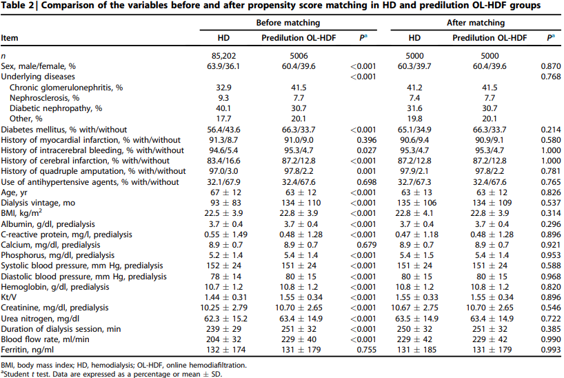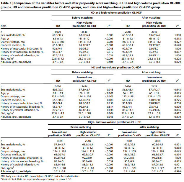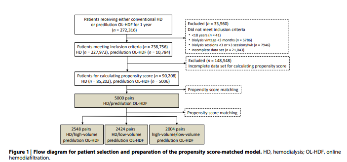 本研究では、1 年全死因死亡率や 1 年心血管死亡率などの生存転帰を、全死因死亡率や 1 年心血管死亡率などの生存転帰が、HD、前希釈 OL-HDF、1 セッションあたり ≧40.0 L の置換量を伴う前希釈(大容量前希釈 OL-HDF)、およびセッションあたりの置換量が 40.0 L 未満の前希釈 OL-HDF (低容量前希釈 OL-HDFの群間で比較されました。 1 年間 (2012 年 12 月 31 日から 2013 年 12 月 31 日) にわたる JRDR データベースを使用した傾向スコア マッチングによる前希釈 OL-HDF の最適な置換量も推定されました。