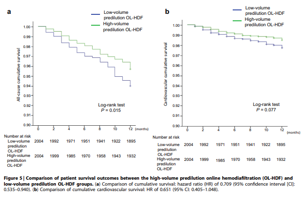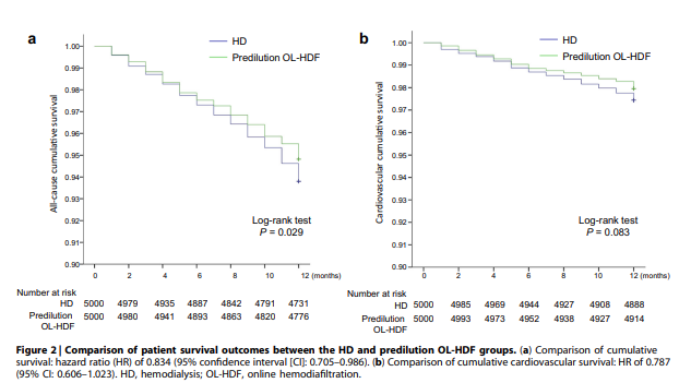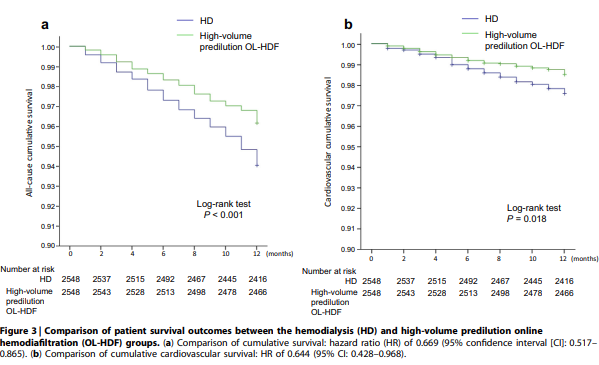 ログランク検定(P < 0.001)およびコックス回帰分析に基づくと、大量前希釈OL-HDF群の1年全死因死亡率はHD群より有意に低かった(HR 0.669(95%信頼区間 CI: 0.517 ~ 0.865; 図 3a)。 ログランク検定 (P = 0.018) および Cox 回帰分析に基づくと、大容量前希釈OL-HDFグループの1年心血管死亡率もHDグループよりも有意に低かった (HRは0.644 (95%信頼区間 CI: 0.428–0.968; 図 3b)。これは大容量の前希釈OL-HDFに関連する1年全死因死亡率と心血管死亡率の両方が大幅に改善されたことを示しています。