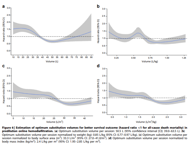 ただし、以下の要因が関係している可能性があります: (i) β2-ミクログロブリンおよびサイトカインの除去の増加。 (ii) 血行力学的安定化の向上による透析誘発性低血圧の予防。 (iii) より高い置換量を達成できる患者の特徴。 Okらによると、より高い置換量を達成した8人の患者は、より高い血流速度とより高い血清アルブミンレベルを含む、比較的健康状態が良い傾向があり、これが患者の生存転帰の改善につながる可能性がある。 血流速度や透析期間など、前希釈OL-HDFで高い置換量を達成する能力に影響を与える要因を評価するには、さらなる分析が必要です。 前希釈 OL-HDF (低容量前希釈と高容量前希釈 OL-HDF を組み合わせた) の有益な効果を調べると、1年全死因死亡率から、HDと比較した前希釈 OL-HDF の有益な効果の理由が、大量置換以外に特定される可能性があります。 3つのRCT(ESHOL study 6)、CONTRAST study 7)、OL-HDF study 8))によると、生存結果を改善するには、後希釈 OL-HDF に 20 L以上の濾過速度が必要です。 ただし、この濾過速度を達成するには、比較的高い血流速度 (300 ml/分以上) が必要です。 前希釈OL-HDFでは、対流量は血流量によって制限されず、本研究のように血流量が平均約 230 ml/min の患者でも実施できます。したがって、前希釈OL-HDF は、血流量が低く、血清アルブミン値が低い患者に使用するのに適した方法であると考えられます。 この報告書は、傾向スコアのマッチングにより、前希釈OL-HDFは、特に置換量が多い場合、HD と比較して生存転帰を改善できることが示唆されます。 この研究の前希釈OL-HDF 群の場合、より良い結果を得るためのセッションあたりの最適な置換量も50.5L (95% CI: 39.0 ~ 63.5 L) であると推定されました。 ただし、この後ろ向き観察研究で提示されたデータは、その限界を考慮して解釈する必要があるため、これらの結果は単にいくつかの臨床ガイドラインを提供するだけです。 HD および前希釈OL-HDFを受けている患者の透析期間は長く、よく一致していますが (それぞれ 135 ~ 106か月および 134 ~ 109か月)、残存腎機能に関するデータはありません。これは、残存腎機能が患者の生存にほとんど影響を与えないことを示しています。