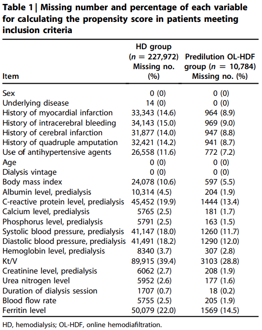 患者は、図1に示すフロー図に従って JRDR データベースから選択されました。年齢18歳、透析歴3か月、透析頻度1週間あたり3回という包含基準を満たした 238,756 人の患者のうち、148,548人の患者は、透析を開始する前に取得すべき傾向スコアを計算するための変数が欠落しているため、傾向スコアのマッチングに含まれるべきではありませんでした。HD 群 (n = 227,972) および前希釈 OL-HDF 群 (n = 10,784) について、包含基準を満たす患者の各変数の欠損数を表1にまとめます。 欠損値の割合が高い変数は、両グループの Kt/V、フェリチンレベル、透析前のCRPレベル、透析前の拡張期血圧と収縮期血圧でした。 HD グループと前希釈 OL-HDF グループで欠落している割合は、それぞれKt/Vで 39.4%と28.8%、フェリチンレベルで22.0%と14.5%、透析前CRPレベルで19.9%と13.4%、透析前の拡張期血圧で18.2%と12.0%、透析前の収縮期血圧はそれぞれ18.0%と11.7%でした。