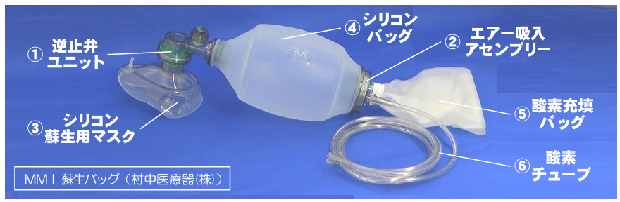 この写真は、所謂フル装備のバッグバルブマスク(以下、BVM)です。恐らく普段急変の現場で見るのは①~④のパーツ構成のBVMではないでしょうか。