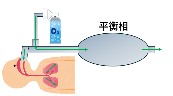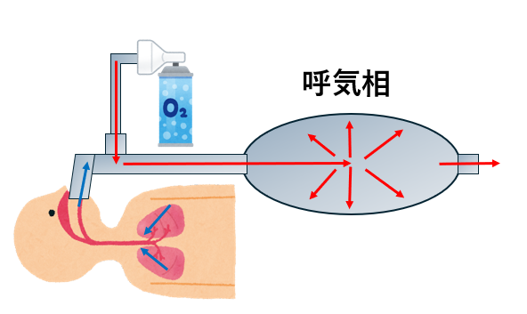 まずは呼気相。画像の様に、患者の呼気相には、バッグ内へ呼気、つまりはCO2を吐いている事になります。そしてO2と混合されながらバッグを膨張させます。