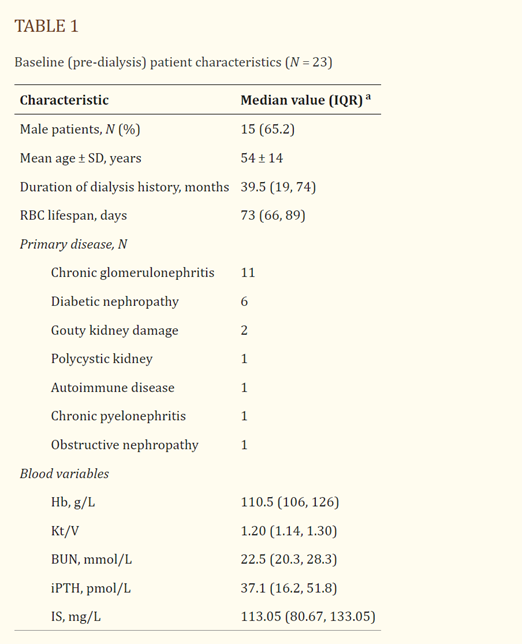 維持血液透析を受けているESRD患者23人を登録した。 性別、年齢、透析歴、透析前ヘモグロビン(Hb)、血中尿素窒素(BUN)、インタクト副甲状腺ホルモン(iPTH)、シングルプールKt/V(spKt/V)、血漿インドフェノール硫酸塩(IS)のベースラインデータを収集した。 HDFを1回行う前と後の赤血球寿命を比較した。 その結果、ベースラインのデータとの相関分析が行われた。