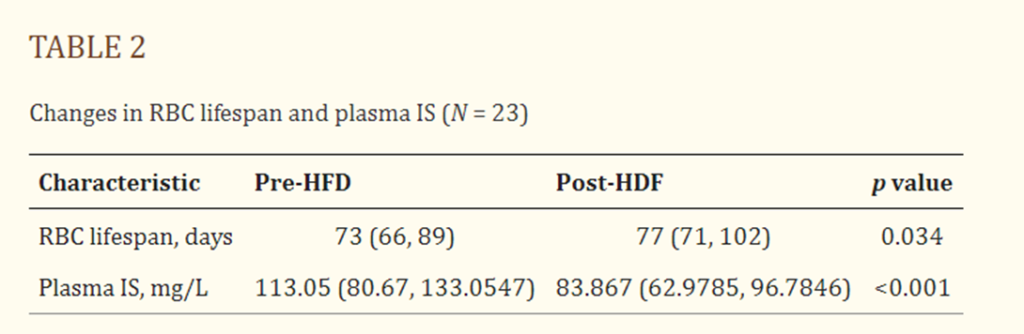 図1と表2の箱ひげ図に示されているように、1回のHDFセッションは、ESRD患者の赤血球寿命中央値を73(66、89)日から77(71、102)日に有意に増加させた(p = 0.034)。 一方、HDFセッションは、血漿IS濃度の中央値を113.05(80.67、133.0547)mg/Lから83.867(62.9785、96.7846)mg/Lに減少させた(p<0.001)。