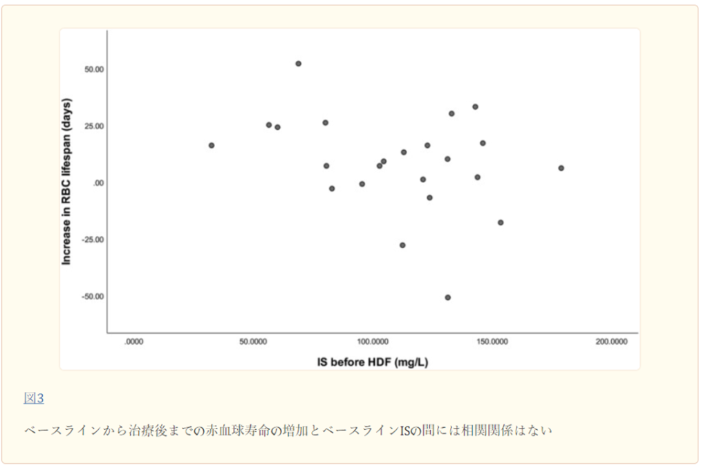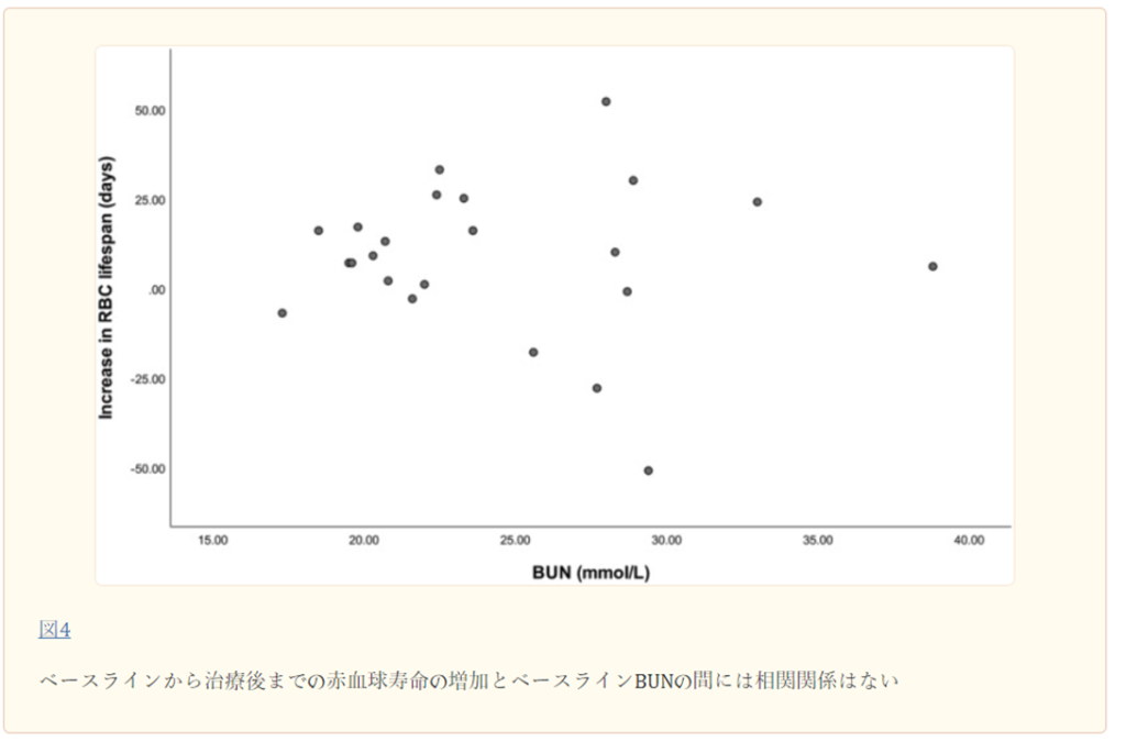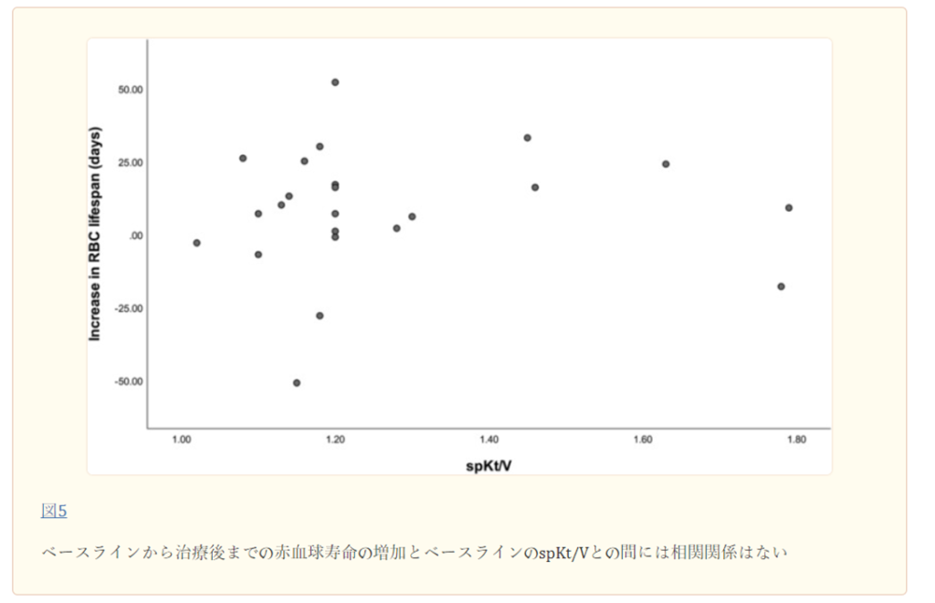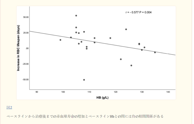 HDF後の赤血球寿命の変化と、年齢、性別、透析年数、spKt/V、IS、Hb、BUN、iPTH値などのベースライン特性との関係を調べるために、スピアマンの二変量相関分析を行った。 図2に示すように、赤血球寿命の増加はHbと逆相関することがわかった(r = -0.577、p = 0.004)。 他のパラメータとの相関は見られなかった(図3、4、4、55)。