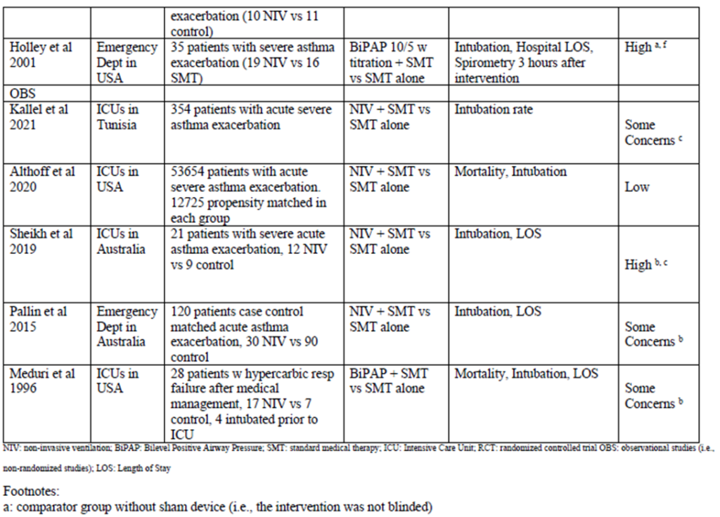 複数の臨床診療ガイドラインでは、急性喘息増悪時の非侵襲的換気(NIV)に関する推奨が、エビデンスが乏しいために欠落している。 しかし、これらのガイドラインのためのエビデンス統合は数年前に行われ、より最近のランダム化比較試験(RCT)や観察研究が発表されている。