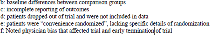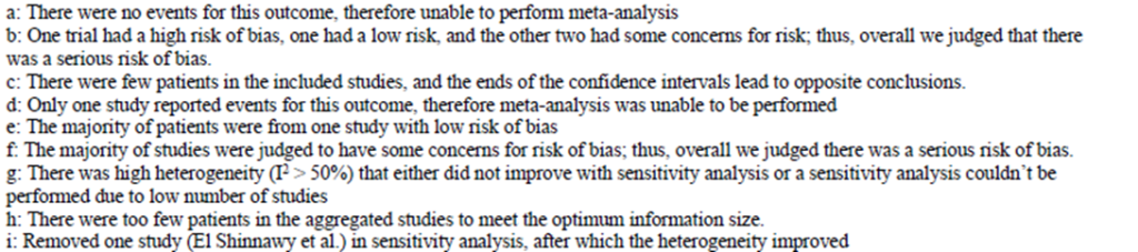 RCTから得られた推定効果の信頼性は、深刻なバイアスリスクと深刻な不正確さのため低い。 観察研究から得られた推定効果の信頼性も低い。 ほとんどの観察研究は小規模であり、バイアスリスクが懸念されたが、推定効果に最も多くの患者を提供した研究は、バイアスリスクのない大規模研究であったため、バイアスリスクによるダウングレードは不要と判断された(表 2)。