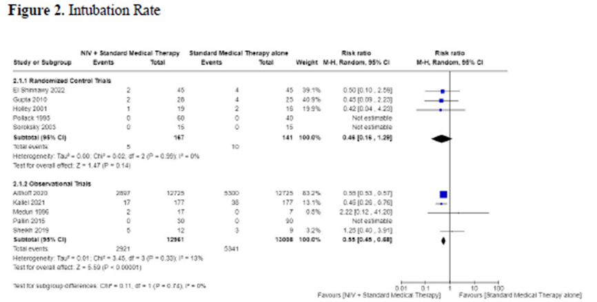 注目すべきは、RCTと観察研究で (それぞれRR 0.46と0.55)同様の点推定値が得られたことである。 このことは、観察研究では統計学的に有意な結果が得られたが、RCTではイベント数が多かったため(観察研究では8,262件の挿管に対し、 RCTでは15件の挿管)、有意な結果が得られなかったことを示唆している。
