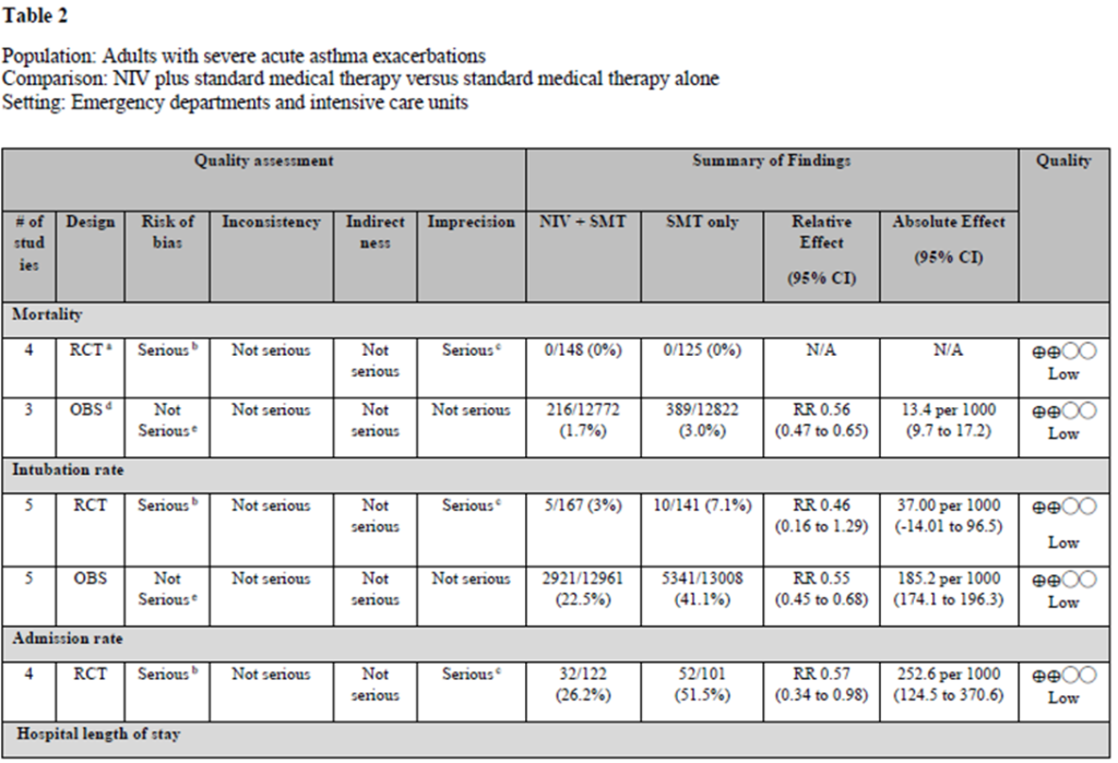4つのRCTで死亡率が評価されたが、いずれの群でも死亡例はなかった。3つの観察研究のうち2つも同様であった。死亡が報告された唯一の観察研究(16)は、各群12,725人の患者を対象とした傾向一致コホート研究であった。 NIV+SMT群で216人、SMT単独群で389人が死亡した(1.7%対 3.1%、RR 0.56、CI 0.47-0.65)。 本試験の観察デザインは、バイアスのリスクが低く、矛盾、 間接性、不正確性がないと判断されたにもかかわらず、 推定効果の信頼性は低かった(表2)。
