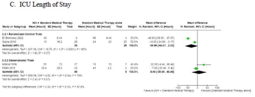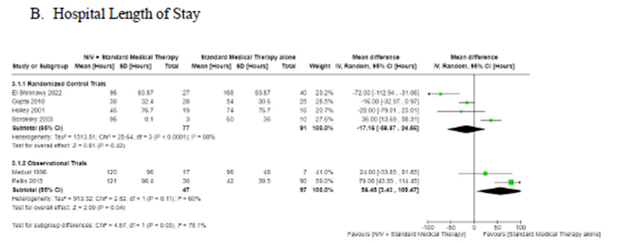 在院日数は4件のRCTで報告されている(9-11, 14)。 RCTのメタアナリシス 、NIV + SMTは入院期間 (図3B、平均差-17.6時間、CI [-58.9]-24.6)を非統計的に有意に減少させることがわかった。