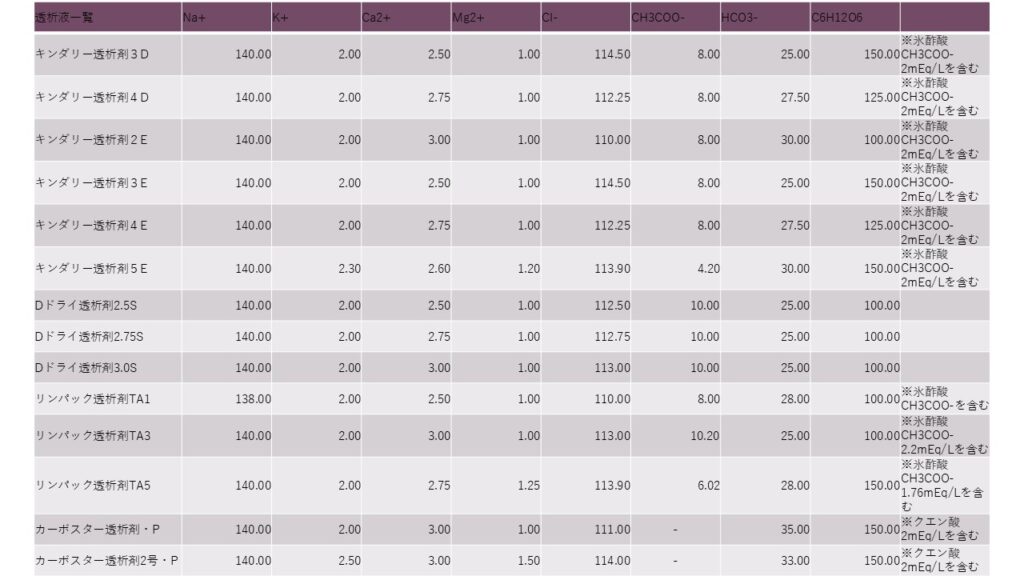 今回、やっとこさ重い腰を挙げて、透析液一覧を作成しました。