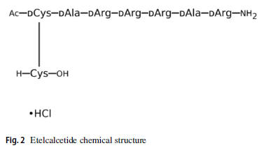 Etelcalcetideは小型の合成ポリカチオン性ペプチドカルシミメティクスであり、成人血液透析患者における二次性 副甲状腺機能亢進症の治療薬として、2016年11月に欧州で、2016年12月に日本で、 、2017年2月に米国で承認された。 本薬は、分子量1048 Daの8種類のアミノ酸を含有している。 エテルカルセチドは、エテルカルセチドのd-システインとカルシウム感受性受容体の細胞外ドメインのシステイン482との間に共有結合性のジスルフィド結合を形成することにより、カルシウム感受性受容体のアロステリック活性化を長時間持続させる[19]。 対照的に、エテルカルセチドは直接カルシウムを感知する レセプターアゴニスト活性を持つが、カルシウム存在下で観察されるのと同じ大きさの反応を起こすには、約30倍の多くのリガンドが必要である(図2)。 シナカルセットと同様に、エテルカルセチドは、PTH(健常人では2時間以内に 、血液透析患者では約30分後に )、カルシウム、リン、FGF-23の値を、用量依存的に急速に低下させる。CKD患者におけるエテルカルセチドの薬物動態プロファイルはシナカルセトとは異なる。 エテルカルセチドは 糸球体ろ過である。 したがって、その血漿中排泄半減期は腎機能の低下とともに有意に増加し、 CKD患者では有効半減期が3~5日と短い。 単回静脈内投与により、血液透析患者では 72時間までPTH値を低下させることができる[20]。 このように半減期が長いため、毎週3回、血液透析の終了時に静脈内投与することができる。1回静脈内投与後、週3回、4時間の血液透析を定期的に行うと、薬剤の約60%が除去される。一方、薬剤の3%が尿から、6%が糞便から、 31%が非特異的なメカニズムで排出される。 エテルカルセチドはプロテアーゼによる酵素分解に耐性があり、チトクロームP450とは相互作用しない。 内因性チオールとのジスルフィド交換( )により生体内変換を受け、アルブミン-ペプチド結合体が可逆的に形成される。 これらの 複合体は、分子量が67 kDaであるため、透析不可能である。 l-システイン存在下では、逆ジスルフィド交換によりエテルカルセチドが改質され、逆反応よりも順 反応の方が早く結合体を形成する[20]。 Blockら[21]は、6ヵ国1023人の中等度透析患者を対象に、2つの並行第III相二重盲検無作為化試験を行った。 ブロックら[21]は、 6カ国の中等度から重度の二次性副甲状腺機能亢進症 (PTH > 400 pg/mL)の透析患者1023人を対象に、2つの並行第III相二重盲検無作為化試験を行った。 患者は、従来の二次性副甲状腺機能亢進症治療に加えて、 エテルカルセチドまたはプラセボのいずれかを血液透析後に 26週間投与された。 主要エンドポイントは、20週目から27週目までの有効性評価段階において、ベースラインからPTHが30%以上減少した患者の割合であった。 両試験において、エテルカルセチドを投与された患者は、主要有効性エンドポイントを達成する可能性が有意に高く、それぞれ74.0%対8.3%(P = 0.001)、75.3%対9.6%(P = 0.001)でした。さらに、エテルカルセチド群では、平均PTHレベル< 300 pg/mLを達成した患者が多くなりました(49.6%対5.1%、53.3%対4.6%、P = 0.001)。カルシウム模倣薬のカルシウム低下効果は早期に観察され、治療10~12週目にカルシウム濃度が最も低くなりました。 さらに、エテルカルセチドは血清リン濃度とFGF-23濃度を低下させた。有害事象に関しては、下痢(10.7% vs 8.6%)、悪心(10.7% vs 6.2%)、嘔吐(8.9% vs 5.1%)、 補正血清カルシウムの症候性減少がエテルカルセチド投与群でより多くみられた(7.0%対0.2%)であった。 最近の前向き観察研究は、二次性副甲状腺機能亢進症の管理におけるエテルカルセチドの有効性を実証している[22–25]。 HD施設は、カルシウム受容体作動薬使用者の75%以上がエテルカルセチド(「エテルカルセチドファースト」)またはシナカルセト(「シナカセトファースト」)を処方されているかどうかに基づいて分類されました。エテルカルセチドファーストの施設では、血清PTH値が低く、PTHが600 pg/mlを超える患者の割合が低かったです。別の実際の評価では、エテルカルセチド治療を受けた患者は、治療の遵守と継続性が高く、特に薬剤と入院に関連する疾患固有のコストが節約されました[27]。