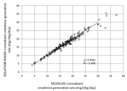 我々の結果は、以前に報告・検証された2-プール動態モデル(文献9)から算出される正規化クレアチニン生成率(CGRn)が、一連の推定式(estimating equations)を用いることで近似的に求めることが可能であることを示している。