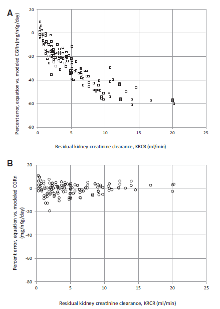 一方、残腎クレアチニンクリアランス(KRCR)を有する患者(平均 5.44 ± 4.82 mL/min)で、補正前の透析前血清クレアチニン値(C₀)を用いた場合、推定式によるCGRn値はモデル値より著しく低値を示した(推定式:12.5 ± 4.85 mg/nkg/日 vs モデル:17.3 ± 5.80, P < .001)。