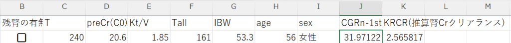 - K列:推算腎クレアチニンクリアランス計算列。自尿がある人は、J列がここを元に計算します。