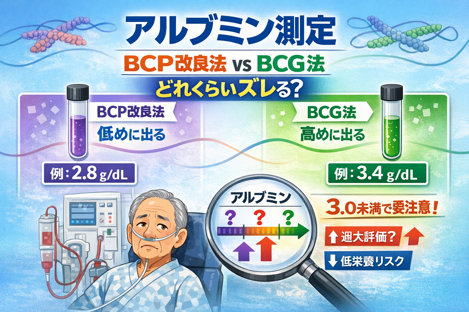 Albumin測定には2種類あり、それぞれの測定値には乖離がある。差は0.3 mg/dL。低く出るのはBCP改良法。
